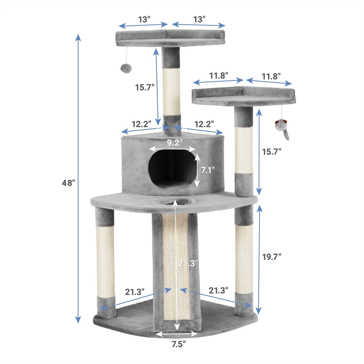 - Carefully placed dangling toys give kitty the thrill of the hunt as they bat them back and forth. Plus, toys are designed to release with excess pressure to make sure kitty is extra safe while playing.
